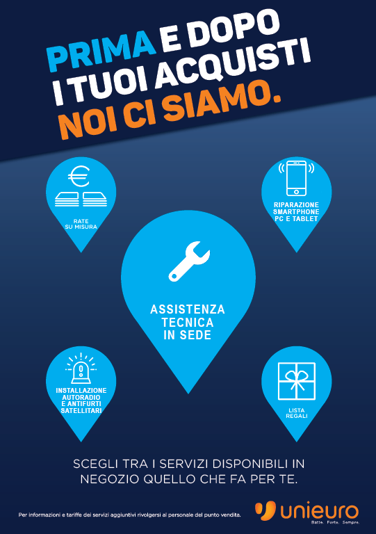 Scopri la tranquillità con i nostri servizi specializzati! Unieuro Ginepri offre assistenza tecnica in sede per PC, Tablet e Cellulari, garantendo soluzioni rapide e professionali. Inoltre, il nostro team esperto ti supporta con l'installazione in sede di Autoradio, Navigatori e Antifurti satellitari, assicurandoti un'esperienza senza stress e risultati di alta qualità. Affidati a noi per la cura e la sicurezza dei tuoi dispositivi e dei tuoi veicoli.